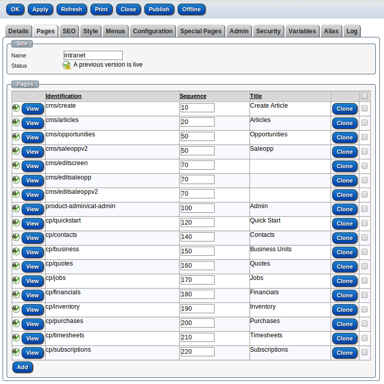2. Click the "Clone" button for the page you'd like to modify, enter a path, eg: cp/myQuickStart and click "OK" button